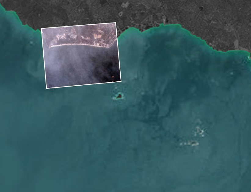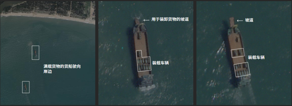 尽管有雾,卫星图像仍捕捉到一艘货船利用自带的跳板直接在海滩卸载车辆。甲板上整齐停放着多辆车,至少一辆已驶上沙滩。