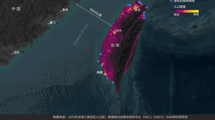 地图显示,台湾人口密集区域主要集中在西部和北部,东部则为山地。图中还标注了中国军方可能进行两栖登陆的台湾西南和北部海滩。 资料来源:2025年全球人类聚居数据(欧盟委员会联合研究中心)、GEBCO、2049项目研究所