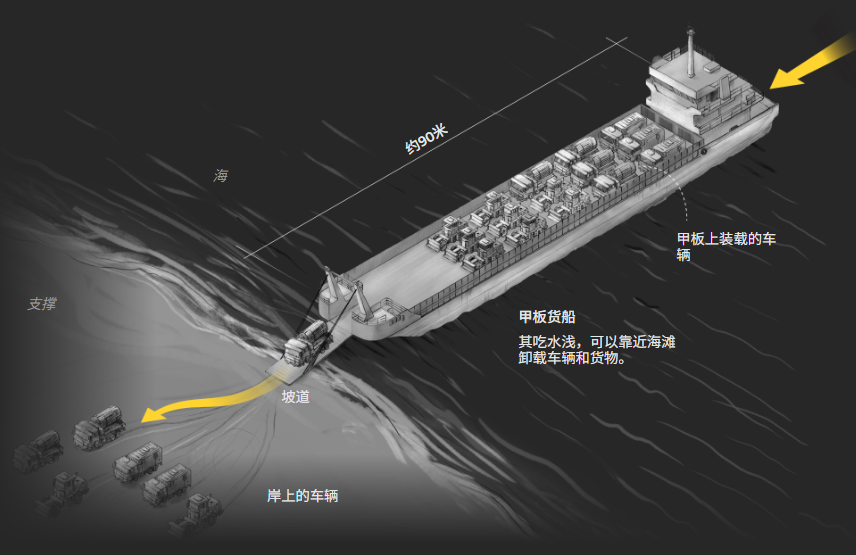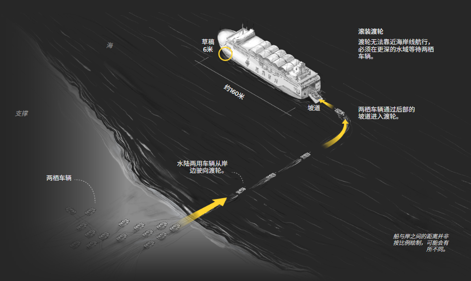 但滚装船吃水较深,无法靠近岸边,需在深水区域等待两栖车辆前来装载。