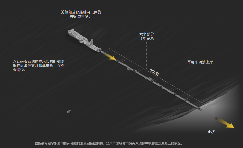 此次演习中使用的仍是2023年后未再露面的旧式浮动码头系统。在登陆海滩外组装完成后,大型货船和轮渡可直接靠泊浮动码头,从而加快部队、装备和补给的卸载。