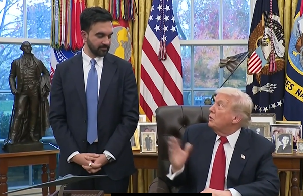 周五在白宫椭圆形办公室,曾被认为是死敌的特朗普和纽约市当选市长佐赫兰·曼达尼,上演了一场令人瞩目的友好互动。