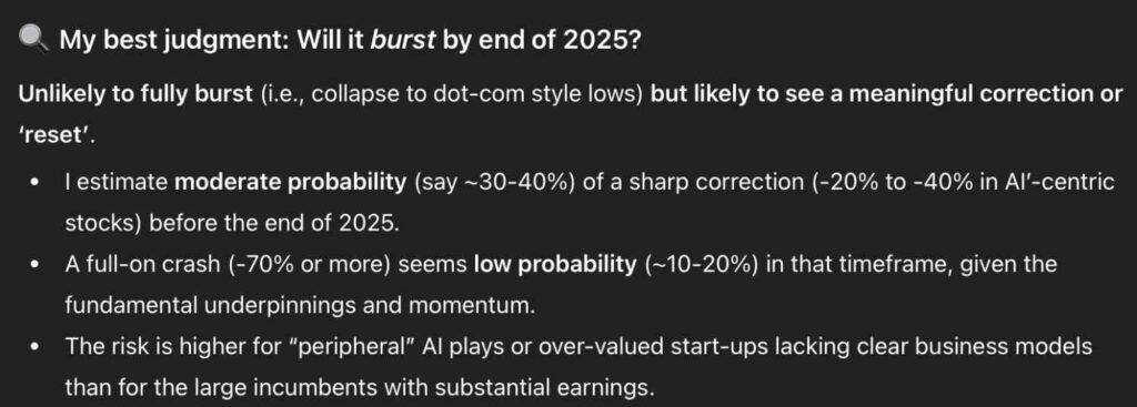 为了从另一个角度评估现状,Finbold向OpenAI最先进的聊天机器人ChatGPT 5提问:所谓的“AI泡沫”是否会在2025年底前破裂。