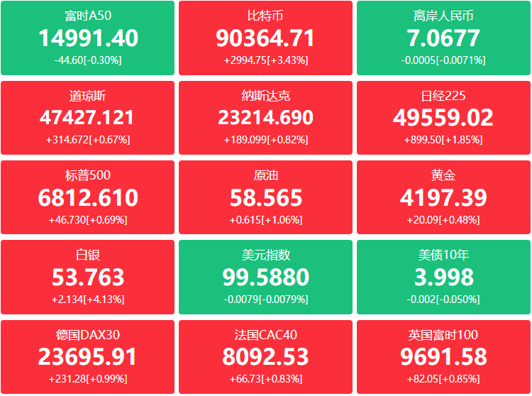 外盘:首申失业金人数低于预期,美股集体收涨,其中道指涨314.67点,涨幅0.67%报47427.12点;纳指涨189.10点,涨幅0.82%报23214.69点;标普500涨46.73点,涨幅0.69%报6812.61点;科技股多数上涨,甲骨文涨超4%,AMD涨超3%,英伟达、特斯拉、奈飞、微软涨超1%。博通涨超3%,创历史新高;中概股涨跌互现,纳斯达克中国金龙指数收跌0.03%。哔哩哔哩、小鹏汽车跌超2%,百度跌1.3%,拼多多涨1.58%,京东涨0.9%,比亚迪ADR涨0.98%,阿里巴巴涨0.38%。