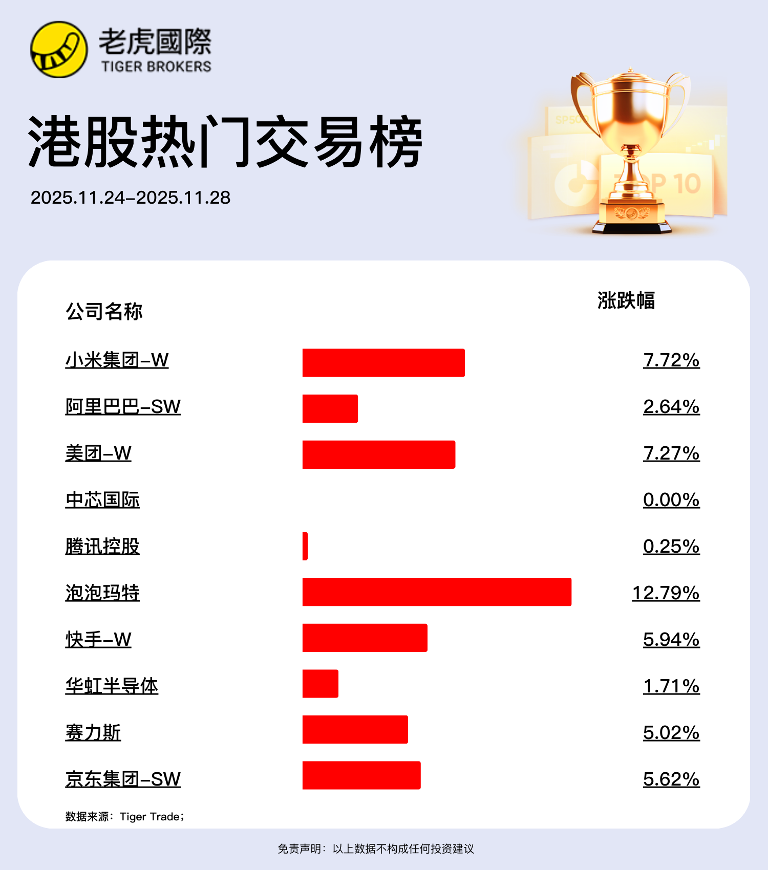 本周老虎用户热门交易个股:Top1:小米集团,本周小米集团发布公告称,公司创始人、董事长兼CEO雷军,24日通过其全资拥有的Team Guide Limited,购入260万股公司B类普通股,平均价为38.58港元/股,持股比例增加至23.26%。受此影响,小米股价重回40港币上方;