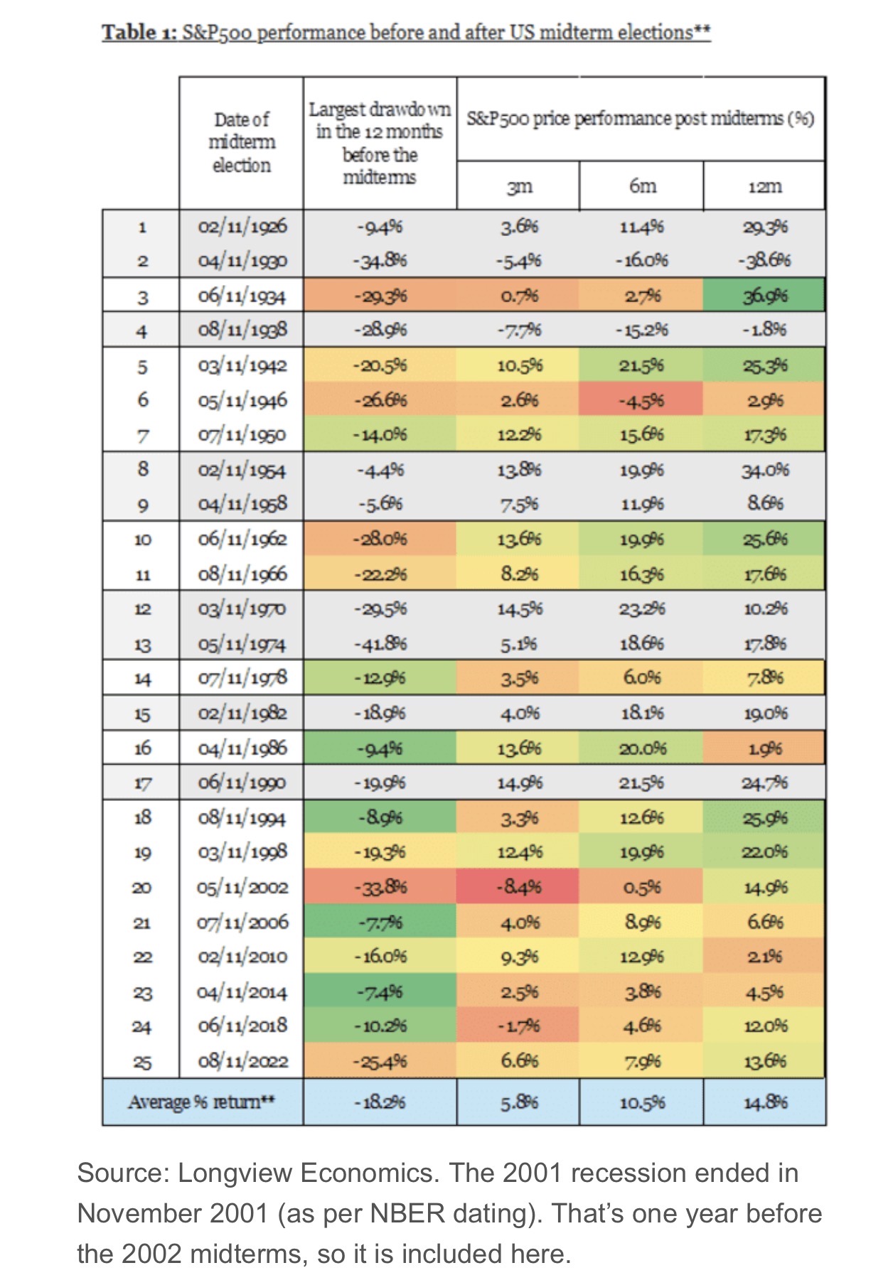 不过,正如表格所显示,这些现象仍然有意思。过去100年里出现了25次中期选举。其中有9次发生在经济衰退前后一年之内,这些在表中以灰色标出,科尔文已将它们排除在分析之外。