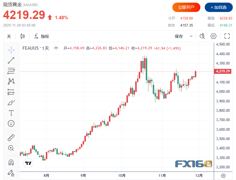 周五美市尾盘,现货黄金上涨 1.48% 至 4,219.29 美元/盎司,盘中最高触及 4,226.83 美元/盎司,本周涨幅达 3.80%或154.39美元,11月份上涨 5.42% 或 216.81美元,连续第四个月上涨。