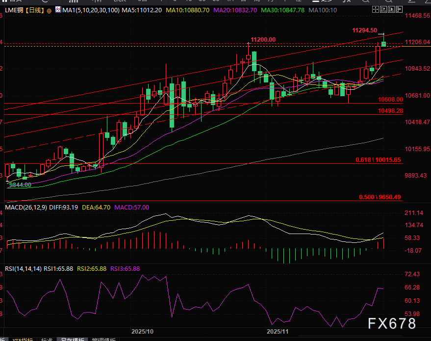 铜价两次触及本轮上涨的0.886回调分位的10608后展开反弹,目前铜价触及上升通道上轨后展开调整。