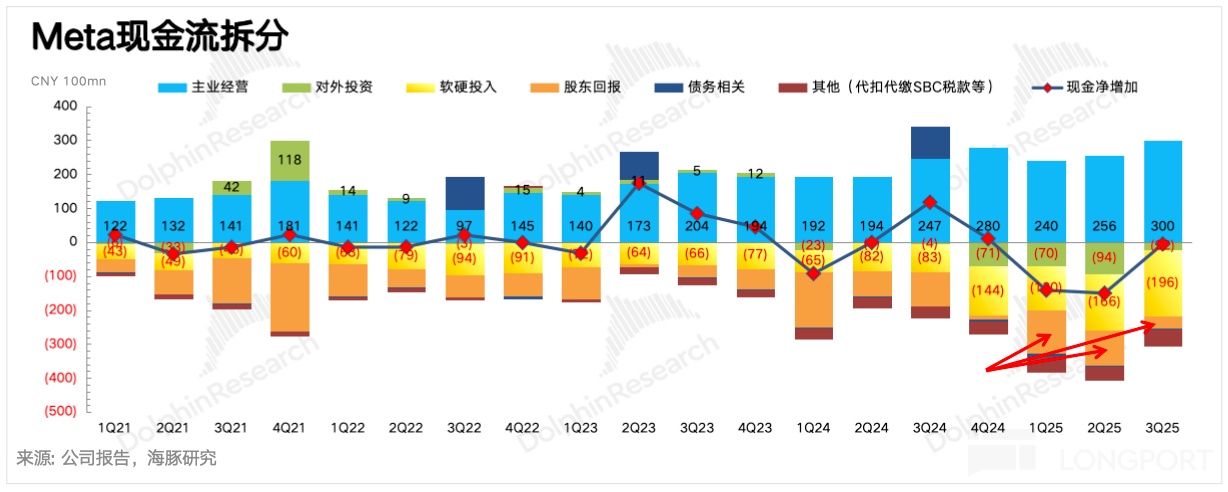 在《腾讯:从抠门的回购谈起,超级 AI 是明晃晃的阳谋?》中,我们之前梳理过 Meta 和腾讯的现金流管理的差异点,其中 Meta 属于是赚多少花多少的 “Cash Neutral” 管理方式——现金流入来自于主营业务获利,现金流出主要用于自身业务投入(包含软件和硬件、固定资产的投入)、股东回报(回购 股息),以及对外投资、其他(代扣代缴税款等)。