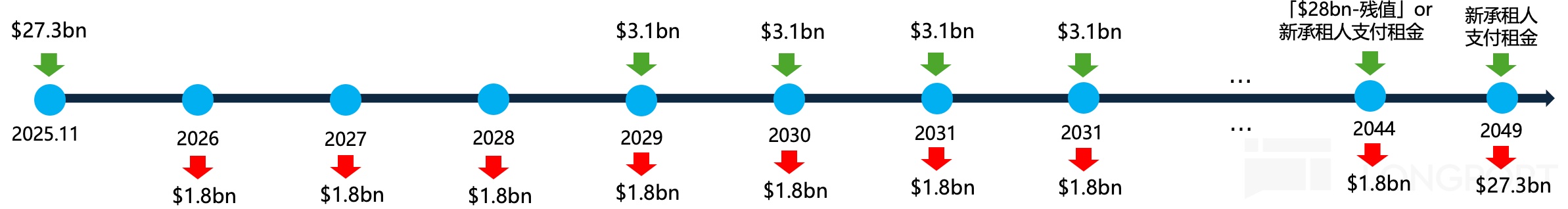 1)权利义务周期错位:当期可以立即拿钱开工,但第一笔 31 亿利息在四年后 2029 年才开始支付,前四年的票据利息由 Blue Owl 来承担。