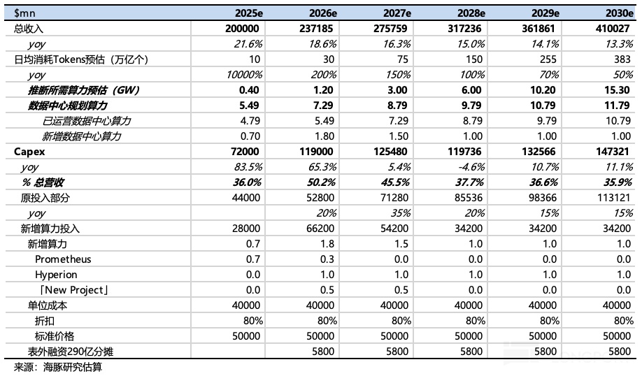 至少在我们的模型中,2030 年的 Meta 数据中心的新增算力只有 1GW,但折旧成本还有 17% 的增速。若要在此之前将 OPM 从 27 年的 36% 拉回到 25 年的 40% ,那么 2030 年收入要达到 4360 亿,相比 2025 年不到 2000 亿的收入水平直接要求翻倍还要多!有意思的巧合,这多出来的 2000 多亿,刚好也是 OpenAI 对自己 2030 年的收入增长目标。