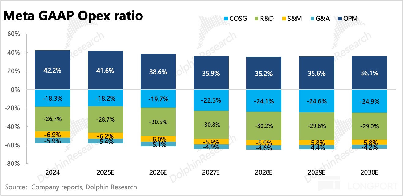 上述折旧费用对利润率滑坡的影响,会在 2027 年达到巅峰,一年掉 3 个点,2028 年之后才会逐步缓和。超预期的可能,一个是算力成本大降,一个则是靠 Meta 在经营费用上做更多让步,比如优化人员等等,利润率滑坡有望比海豚君的预期提前触底,但显然前者的效果更加事半功倍。