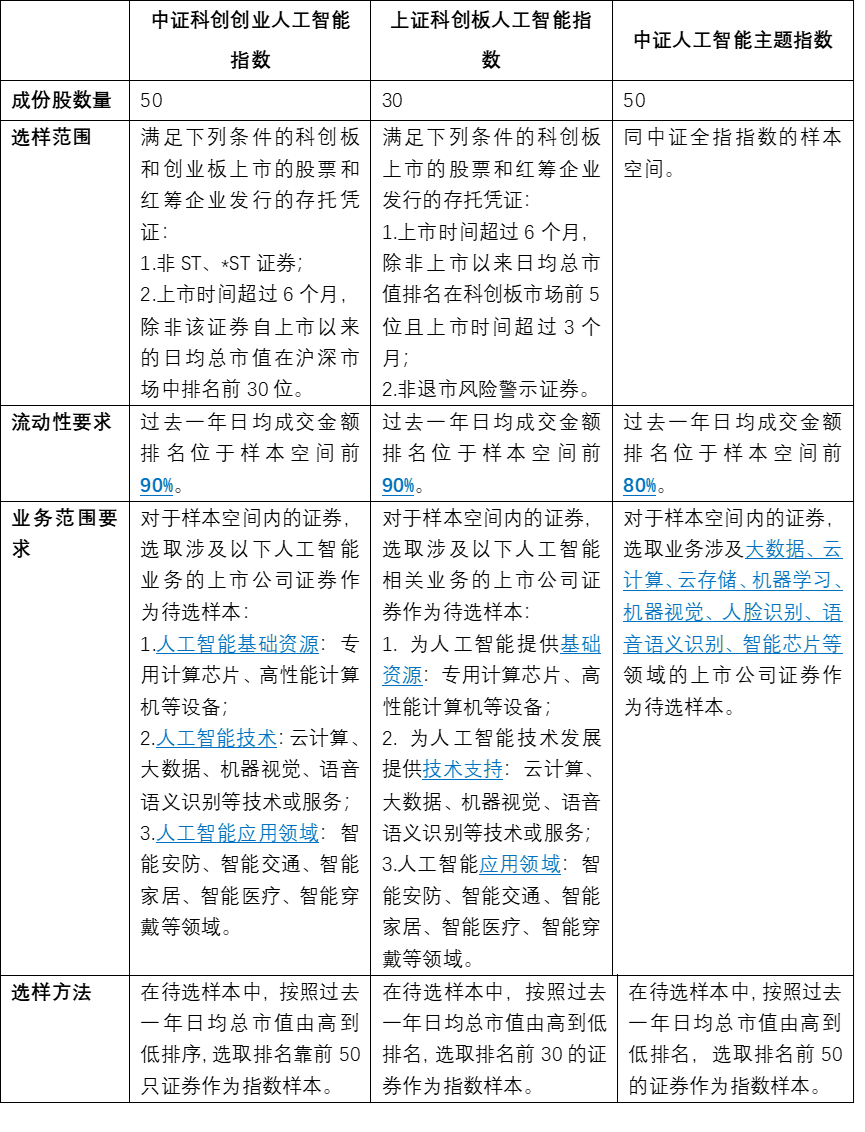 先从选样范围来看,科创创业人工智能指数聚焦科创板和创业板上市的股票及红筹企业发行的存托凭证,对高市值企业的上市时间门槛更灵活,而科创人工智能指数则限定于科创板、人工智能指数的样本空间同中证全指。而流动性方面,前两者要求过去一年日均成交金额排名位于样本空间前90%,后者为前80%;科创创业人工智能指数和人工智能指数成份股数量均为50只,科创人工智能指数为30只。