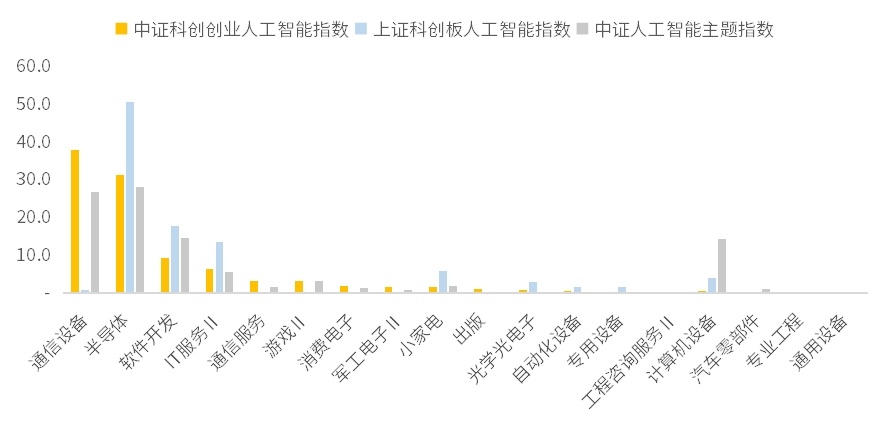 图1:三只人工智能相关指数的行业分布对比(%,按申万二级行业)
