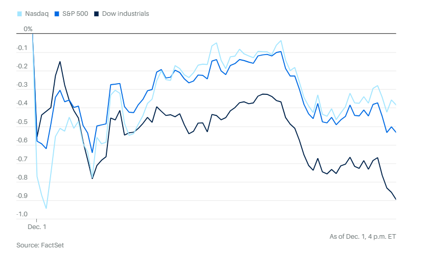 在连续五天上涨后,美股在12月以下跌开局。标准普尔500指数下跌0.5%,道琼斯指数下跌0.9%,纳斯达克指数下跌0.4%。跌幅最大的是公用事业板块,这一板块通常被视为股市中最安全的领域之一,这表明市场正出现全面抛售。