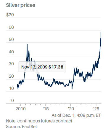 尽管股市经历了动荡的一天,但在白银市场,情况却光亮得多。追踪白银价格的连续合约期货周一上涨1.5%,交易价格约为每盎司58美元,创下自1972年有数据以来的历史新高。