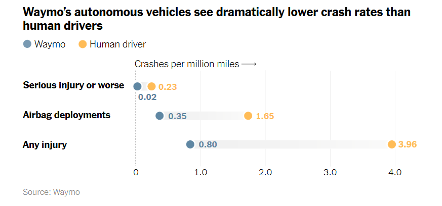 目前其他自动驾驶公司要么不公布数据,要么数据不完整。与之相比,Waymo公布了我进行分析所需的一切内容:包括事故数量与行驶里程,可以精确对比同一地点人类驾驶的表现。