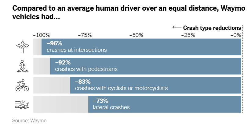 无人驾驶公司Waymo最近公布了截至2025年6月,在四座美国城市累计近1亿英里的无人驾驶数据,这是迄今规模最大的安全数据。我花了数周分析这些资料,结果令人震撼。