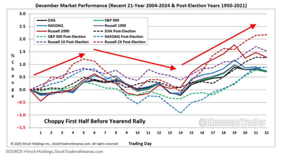分析师在周一发给客户的报告中写道:“12月前六个交易日左右通常会有一波小幅反弹,但到了月中,这波涨势往往会消退。此后,节日氛围逐渐增强,税务抛售的压力一般也会减轻,从而推动股指走高,直到月底附近再出现短暂停滞。”