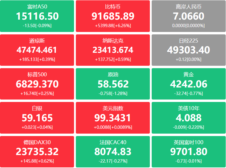 外汇:美元指数跌超0.05%刷新日低至99.319点,美元兑日元涨0.24%报155.83日元,欧元兑美元涨0.12%,英镑兑美元持平,美元兑瑞郎跌0.22%,澳元兑美元涨0.33%,纽元兑美元涨0.13%,美元兑加元跌0.16%;离岸人民币兑美元报7.0670元,较周一纽约尾盘涨49点;比特币期货涨5.42%报91860美元,以太币期货涨7.37%报3000美元。