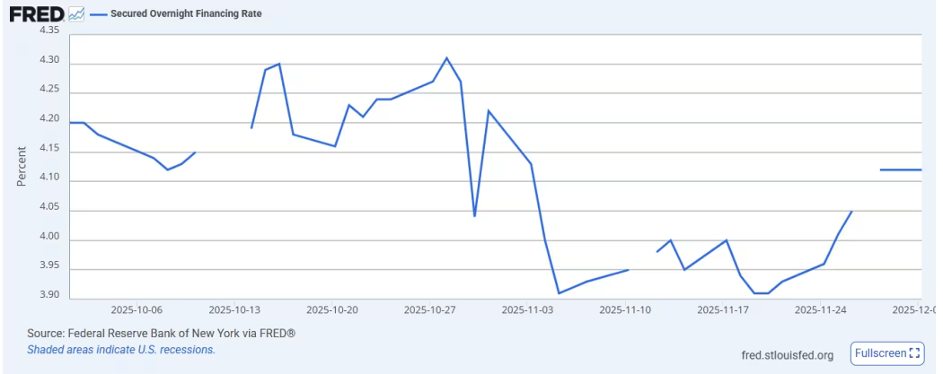 两个衡量融资市场流动性的指标——担保隔夜融资利率(SOFR)和三方一般担保利率——在过去一周均重新升至4%以上,尽管仍低于10月底的峰值。这两个利率来源于美国隔夜回购市场,该市场是金融机构短期融资的关键来源。美联储密切关注隔夜回购市场的压力,因为这可能引发更广泛的市场波动。