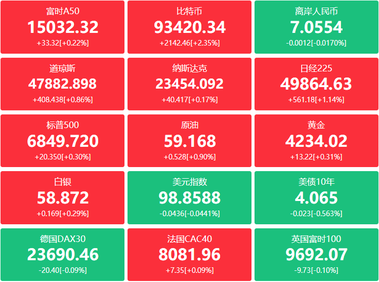 外汇:美元指数下跌0.51%报98.849点,美元兑日元跌0.48%报155.13日元,欧元兑美元涨0.42%报1.1673,英镑兑美元涨1.06%报1.3352,美元兑瑞郎跌0.47%报0.7994;澳元兑美元涨0.57%,纽元兑美元涨0.74%,美元兑加元跌0.16%;离岸人民币兑美元报7.0577元,较周二纽约尾盘涨93点;比特币期货涨2.58%报93815美元,以太币期货涨5.72%报3162.50美元。