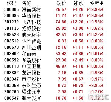 商业航天概念再度走强,海昌新材、华伍股份20CM涨停,达华智能、四川金顶、和而泰、龙溪股份等多股涨停。