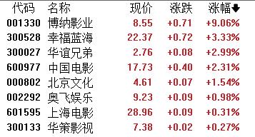 影视院线板块拉升,博纳影业涨超9%,幸福蓝海、华谊兄弟、中国电影、北京文化、奥飞娱乐、上海电影、华策影视等跟涨。