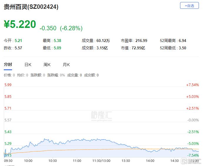 个股异动:贵州百灵跌6.28%至5.22元,总市值跌至72.95亿元。