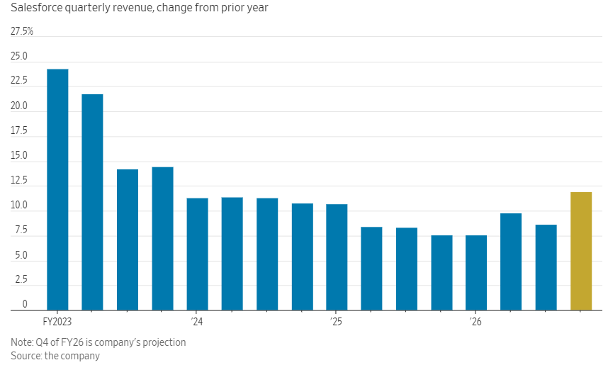 由于对人工智能颠覆性影响的担忧,Salesforce及其他主要软件股今年受到严重打击。Salesforce、ServiceNow和Adobe这三家主要销售订阅式企业软件的公司,今年市值都已蒸发超过20%。