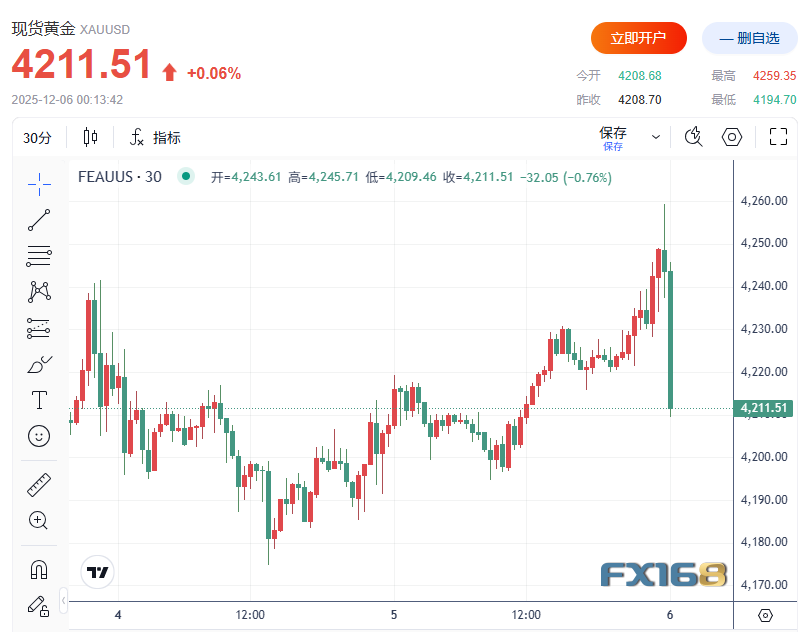 现货黄金刷新日高至4259.35美元/盎司,日内涨超1%,但随后自高位跳水约40美元。