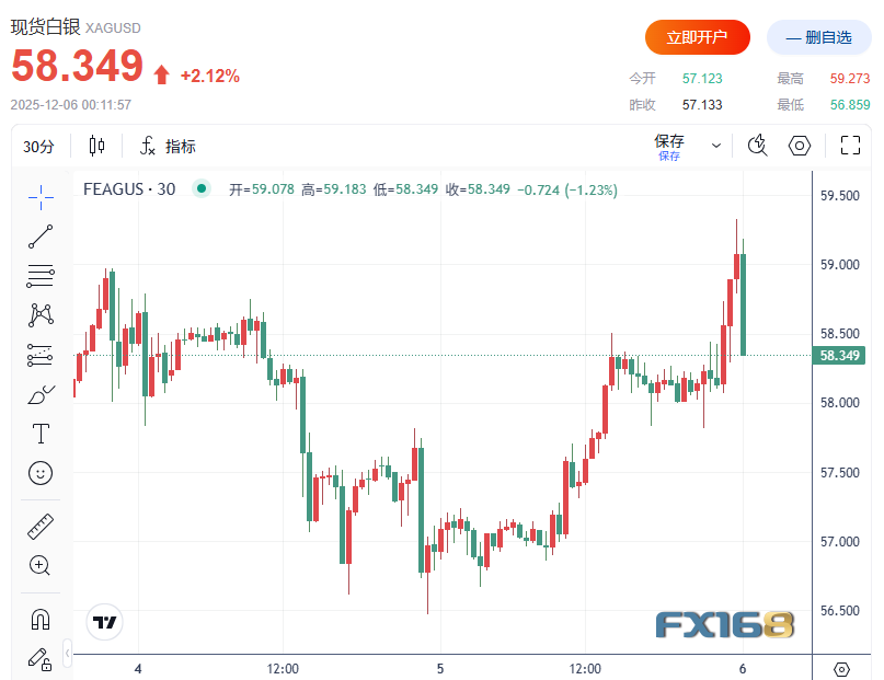 现货白银向上触及59美元/盎司,刷新历史新高至59.273美元/盎司,随后也自高位回落。纽约期银日内一度大涨4.00%,报59.80美元/盎司。