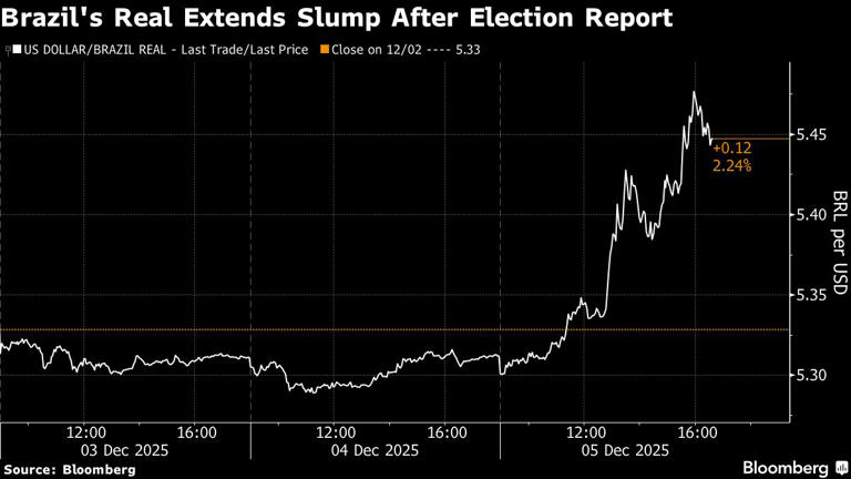 FX168财经报社(北美)讯 巴西资产周五(12月5日)大幅下跌,此前前总统雅伊尔·博索纳罗(Jair Bolsonaro)宣布支持其长子弗拉维奥·博索纳罗(Flávio Bolsonaro)作为右翼阵营的 2026 年总统候选人。