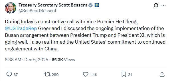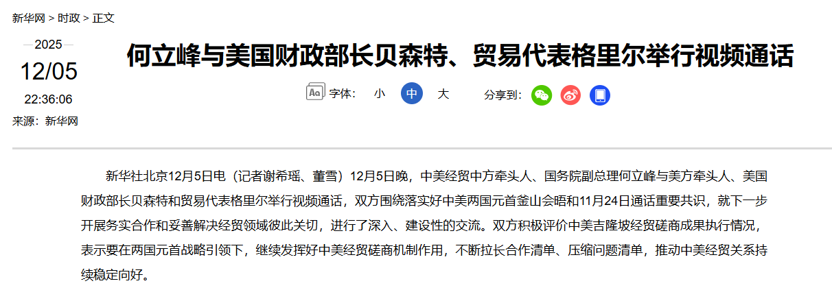 FX168财经报社(北美)讯 据新华社消息,12月5日晚,中美经贸中方牵头人、国务院副总理何立峰与美方牵头人、美国财政部长贝森特和贸易代表格里尔举行视频通话,双方围绕落实好中美两国元首釜山会晤和11月24日通话重要共识,就下一步开展务实合作和妥善解决经贸领域彼此关切,进行了深入、建设性的交流。双方积极评价中美吉隆坡经贸磋商成果执行情况,表示要在两国元首战略引领下,继续发挥好中美经贸磋商机制作用,不断拉长合作清单、压缩问题清单,推动中美经贸关系持续稳定向好。