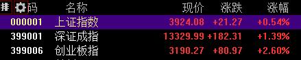 重磅会议指明年继续实施更加积极的财政政策和适度宽松的货币政策,A股三大指数今日集体走高,截至收盘,沪指涨0.54%报3924点,深证成指涨1.39%,创业板指涨2.6%。全市场成交额2.05万亿元,较前一交易日增量3127亿元,超3400股上涨。