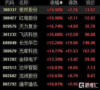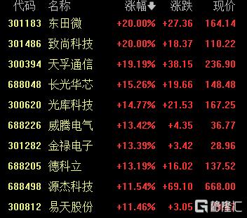 CPO板块再度全线爆发,东田微、致尚科技20cm涨停,天孚通信涨超19%,长光华芯涨超15%,光库科技、威腾电气等跟涨。