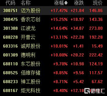 存储芯片股表现强势,迈为股份涨超17%,香农芯创涨超15%,江波龙涨超14%,开普云涨超13%,诚邦股份、德明利10cm涨停。