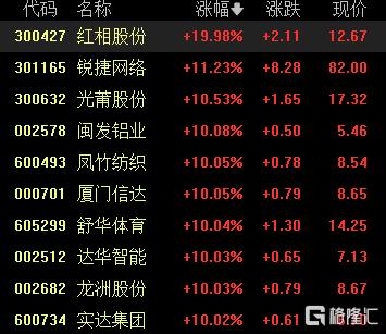 福建板块大涨,红相股份20cm涨停,锐捷网络涨超11%,闽发铝业、凤竹纺织、厦门信达、达华智能等多股10cm涨停。