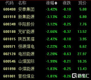 煤炭股大跌,安泰集团、新集能源、华阳股份跌超3%,兖矿能源、陕西黑猫、电投能源跌超2%,山煤国际、中煤能源等跟跌。