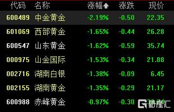 贵金属股走弱,中金黄金跌超2%,西部黄金、山东黄金、山金国际、湖南白银、湖南黄金跌超1%。