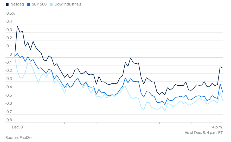 这是连续第二个交易日标普500逼近10月28日创下的收盘高点后回落,多数个股和板块被投资者抛售。不过,部分人工智能概念股逆势上涨,包括博通、英伟达和甲骨文。据彭博报道,特朗普政府即将批准向中国出售其H200芯片。