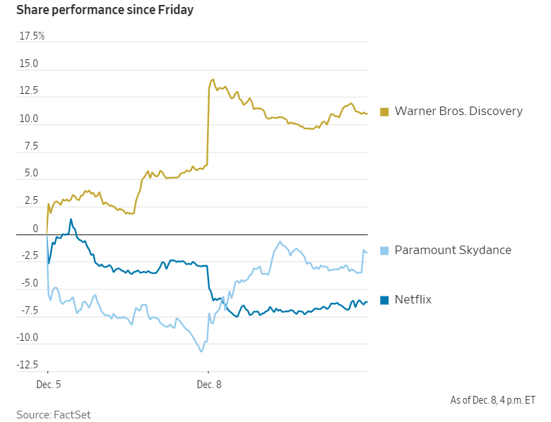 周一早间,派拉蒙正式对华纳兄弟探索发起恶意收购。就在几天前,Netflix刚刚敲定一项价值720亿美元的协议,收购华纳的流媒体和影视制作业务。消息推动华纳和派拉蒙股价周一双双上涨,而Netflix股价下滑。