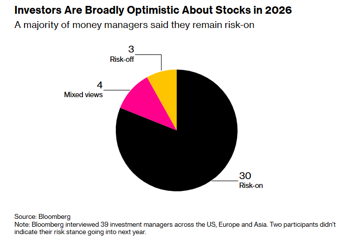 在股票市场方面,彭博采访了来自美国、欧洲和亚洲的39位投资经理,结果显示绝大多数机构在为2026年继续押注“风险偏好”环境。投资逻辑主要基于全球增长韧性、人工智能持续发展、宽松政策延续以及财政刺激的推动,预计将带来超额回报。