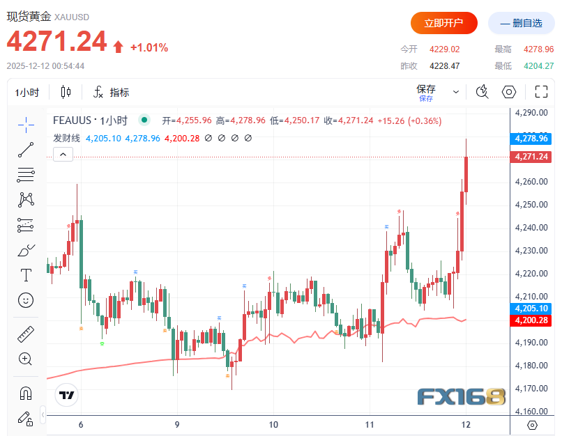 数据公布之初,现货黄金突然急涨超73美元,刷新日高至4278.96美元/盎司。
