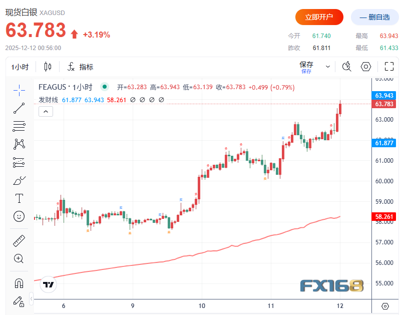 白银方面,现货白银站上63美元/盎司,再创新高,日内涨超3%,年内涨幅已超过115%。纽约期银日内大涨5.00%,现报64.08美元/盎司。