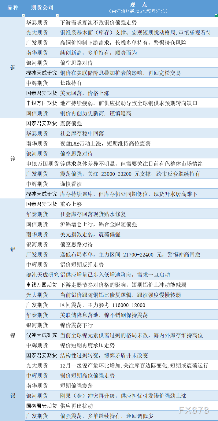期货公司观点汇总一张图:12月12日有色系(铜、锌、铝、镍、锡等)。更多详见本文的汇通财经特制图。