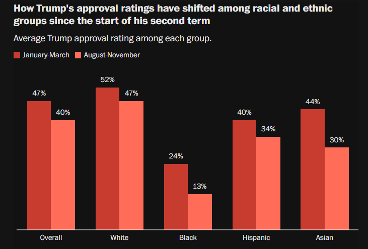 与他在2024年在少数族裔选民中取得的增长相比,下滑很明显。