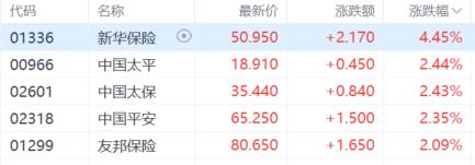 保险股表现活跃,新华保险涨超4%,中国太平、中国太保、中国平安、友邦保险涨超2%。