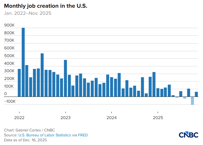 FX168财经报社(北美)讯 美国劳工统计局(BLS)周二(12月16日)公布的数据显示,11月非农就业人数增幅略高于市场预期,但10月就业则出现明显下滑,同时失业率升至四年来高位。由于此前联邦政府停摆,相关数据发布出现延迟,且部分统计仍存在不完整性。