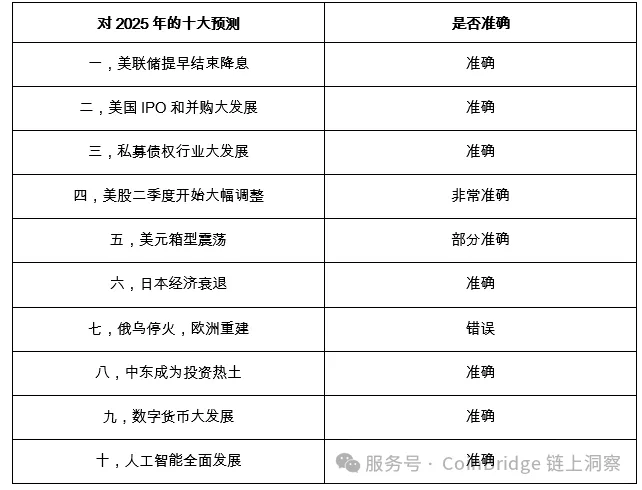 上一次在2024年年底的十个预测中,一个错误,八个准确,一个部分准确。可以说整体准确率是85%。当然,现在回顾起来,一年前最准确的一个预测是美股在今年二季度大幅调整。今年美股在4月-5月跌入熊市,特别是纳斯达克指数下跌超过了30%。当然里面既有白宫的关税政策的冲击,也有大量获利盘担心下行风险的原因。华尔街有一个说法:“预测是特别困难的,特别是对于未来的预测。”