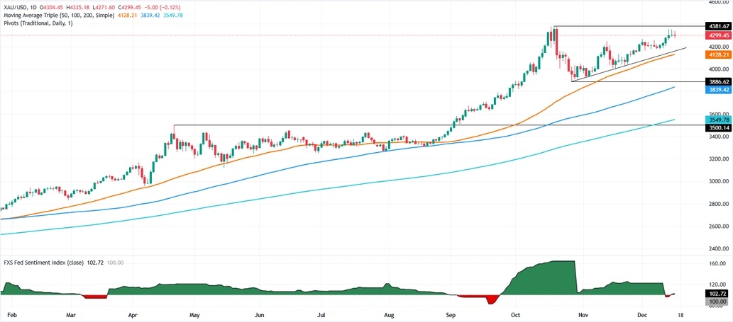 Valencia表示,若要延续上涨趋势,金价必须突破12月12日的高点4353美元/盎司。一旦突破该高点,金价将进一步上探历史高点4381美元/盎司,随后可能进一步瞄准4400美元/盎司、4450美元/盎司和4500美元/盎司。